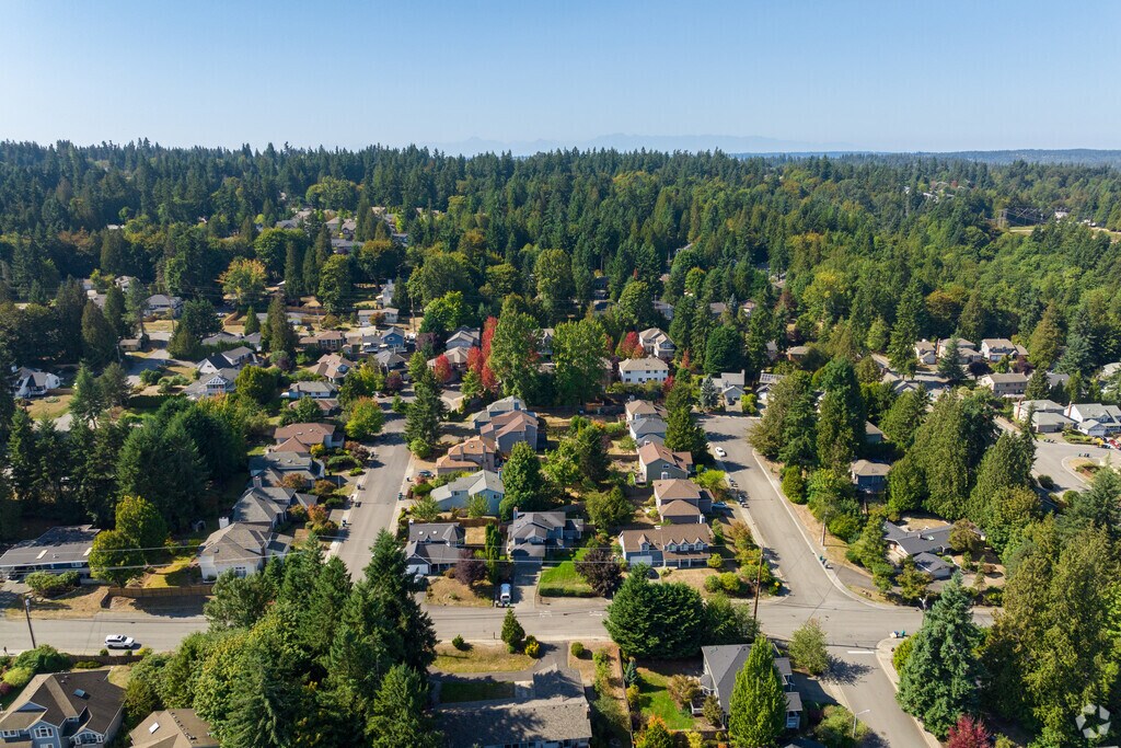 The community's residential areas host various living options for prospective residents in a streetscape lined with towering fir and pine trees. Single-family homes in the area often sit on spacious lots, with some properties stretching out over 12,000 square feet. Houses reflect varying architectural styles, including ramblers around the $1.4 million range to newly built properties priced anywhere from $900,000 up to $1.9 million. On the southern end of the community are condominiums available for purchase and apartment units, many of which come with amenities, including parking spaces and modern interior features.
