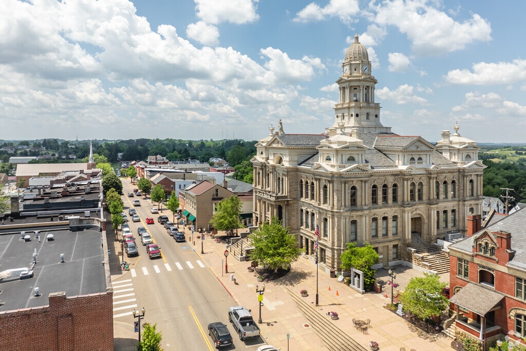 Anchored by a towering historic courthouse, downtown Saint Clairsville has a few boutiques and local restaurants. In addition to several pizza places, Newellstown Diner is a local favorite for its fluffy pancakes and low prices. In 2024, the city approved downtown as a Designated Outdoor Refreshment Area, meaning patrons can walk around with alcoholic beverages.