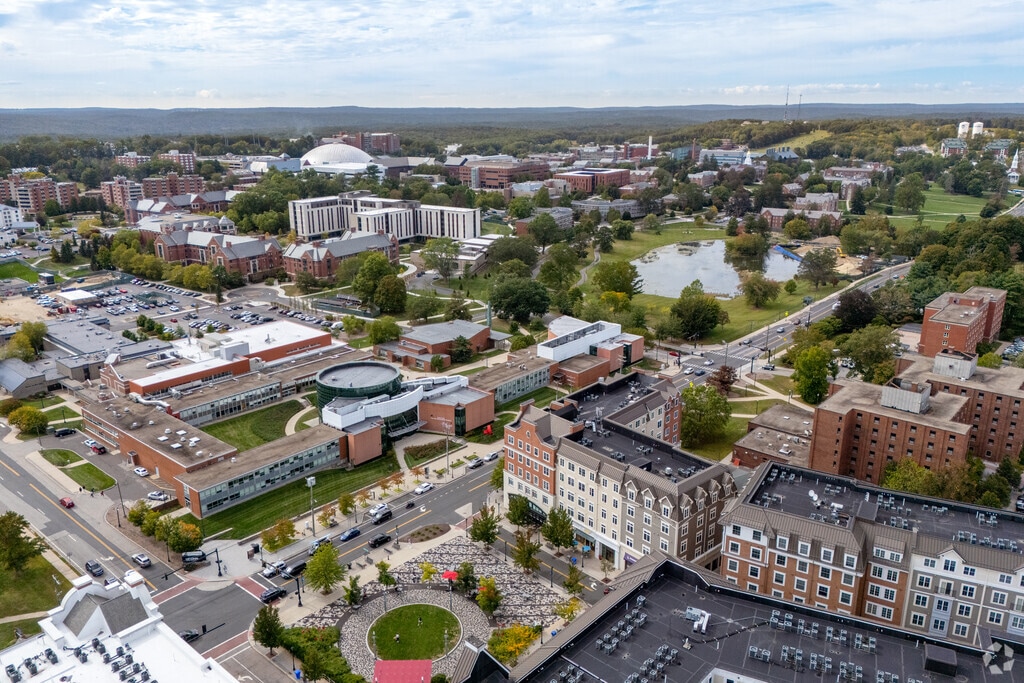 Storrs Mansfield is a vibrant college town with students walking across campus.
