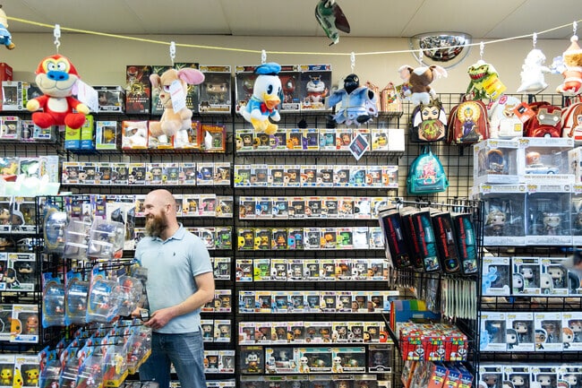 Customers browse the eclectic selection at Bella Comic Books and Toys near Lake Christopher.