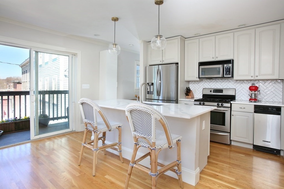 Located on a secluded private way, this spacious 2 bed home boasts 1223 sq. feet of living on two levels, soaring ceilings, a newly renovated kitchen and bath, a sought after open layout and two private outside spaces.Central to all of Charlestown’s shops & restaurants & the “T”, this well configured home gets abundant natural light & offers an ideal floor plan. The just ren. kitchen has freestanding quartz island, tall shaker cabinetry w/dble herringbone backsplash, ss. appliances, hardwoods & glass doors that lead to private deck. Spacious dining directly off the kitchen can fit a large table. Smartly located 1/2 bath & coat closet sit off kitchen & living. Huge living room gets ample natural light w/gas fireplace & recessed lighting. Master bed easily fits king bed & features a wall of custom closets. Oversized bath features 12X24 tile floors, grey vanity w/ marble & subway tile surround. Guest bed is equally large. Stunning private outside area enclosed with fencing is a seclud