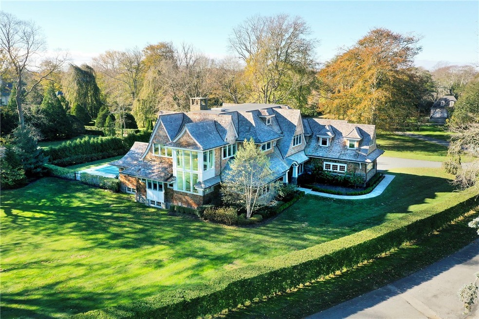 Built and completed in 2017 by Horan Building Company, this stunning stone and shingled home is located in a private, gated estate of Ocean Lawn, originally part of the historic and exclusive Firestone Estate. Offering exceptional details in its design and millwork, Ocean Lawn boasts luxurious living spaces, capturing a classic New England style with modern elegance. The open floor plan lends itself to easy family living and an abundance of natural light with southern exposure. A chef's kitchen includes Rhino marble countertops, professional grade appliances, custom cabinetry and unique lighting. The living areas each with fireplaces, open to a lovely outdoor entertaining area with bluestone patio, heated pool and hot tub. With the primary suite on the main level, there are 7 additional bedrooms offered on 4 levels. Also included are a game room with bar, theatre room, fitness room, and 3 car attached garage. Sited on 3 acres and adorned with specimen trees, the location offers easy access to the famed Cliff Walk, Bellevue, local beaches and trendy downtown Newport. The residence is completely turnkey!