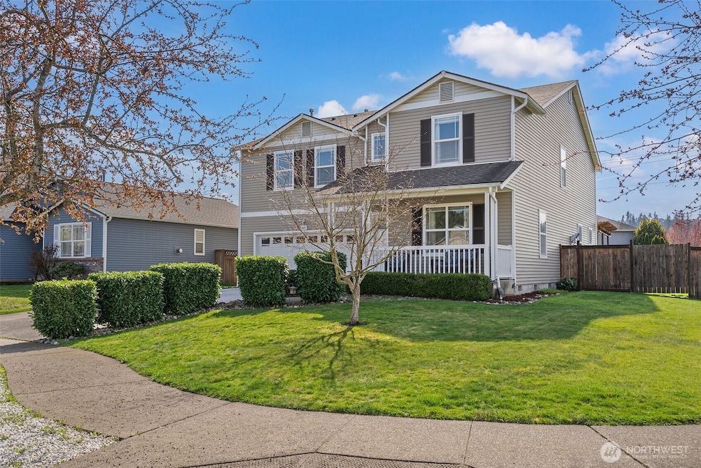 Nestled near scenic trails & High Cedars Golf Course, this immaculate 5-bed/2.5-bath corner lot home boasts a massive floor plan w/ laminate flooring throughout the main level. A beautifully remodeled kitchen features quartz counters, shaker-style soft-close cabinets, & walk-in pantry. Upstairs, a huge loft offers extra living space, while the updated primary bath showcases stylish hexagon slate tile floors. Stay comfortable year-round w/ A/C, & enjoy outdoor living on the expansive deck w/ built-in bench, gazebo, shed & all within a fenced 1/5 acre lot. Additional highlights include an electric fireplace, covered front porch, & 2-car garage. Located a short drive to JBLM, this home offers the perfect blend of space, convenience & beauty.
