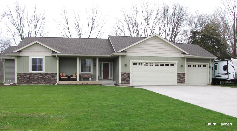 Ranch style home with open floor plan. Neutral decor, river frontage. Master suite with jetted tub, shower, dual sinks & w/c. Main level office.Kitchen features Cherry cabinets,stainless steel appliances, island with seating, and walk in pantry (has washer dryer hook ups). Lower level is finished with rec room, laundry room/wetbar, 2 bedrooms, bathroom,bonus room and family room. Three stall attached garage,central air. Deck, fire pit and Flat river frontage.