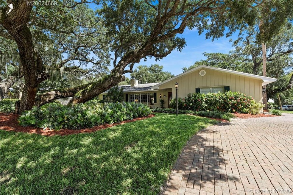 Sewall's Point located on High Elevation lot (Not in Flood Zone). Magnificent Ancient Oaks are focal point of the landscape. Pride of ownership obvious in well cared for CBS 4 BR/3BA home with circular drive to 2 car garage, a separate drive to the rear to hide boat/trailer. GREAT SPLIT FLOORPLAN, Major rooms have direct pool access. Kitchen has real Cherry cabinetry w/ soft close doors/drawers & dovetail drawers, SS appliances, pass thru to pool. Spacious family room open to kitchen w/ breakfast bar. Master suite w/ ample walk-in closet, separate dressing area, & updated tile. Guest wing has 3 Bedrooms (2 are Jack/Jill) & 2 more Bathrms. Formal Living room via foyer entry, w/window wall & stone fireplace. The pool was refinished 3 years ago-irregular shape with swim out, large screened enclosure with kool deck. Chicago brick wall behind bar as well as a hidden room, too. Fantastic location across bridge to beach and boat launches. Fresh Market Grocery & Publix each only 5 minutes