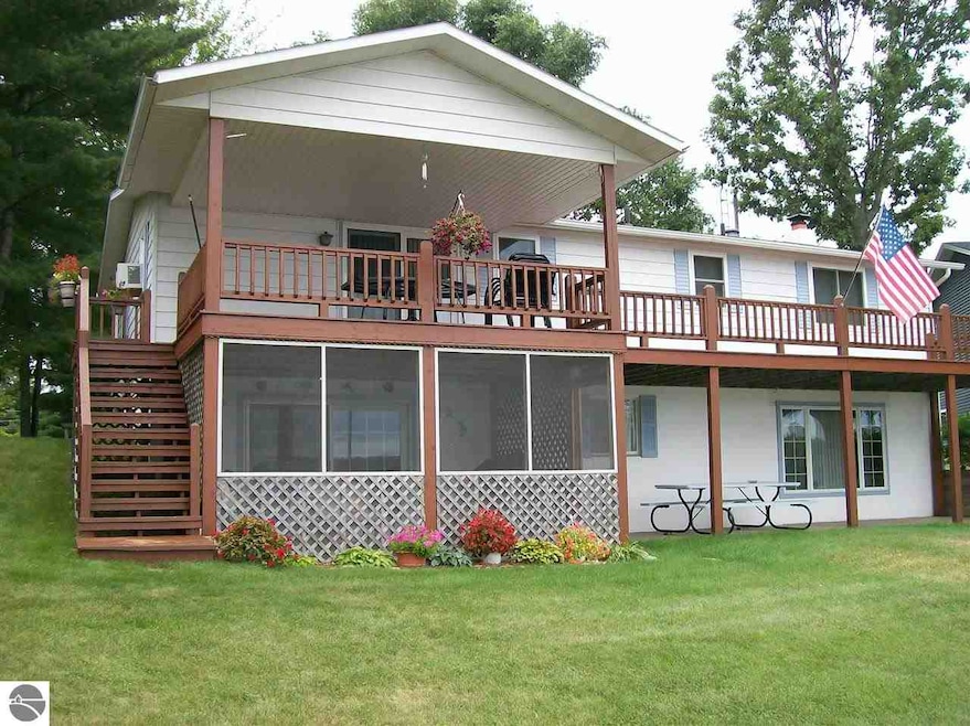 Enjoy 9.1 miles of shoreline at private all sports Lake Ogemaw. 60' of frontage on main lake. 3 bedrooms, 2 bath, full finished basement includes 2 kitchens, family room, fireplace, screened in sun room and bonus room. Covered deck to relax and enjoy the beautiful view. 3 car garage plus circle drive.