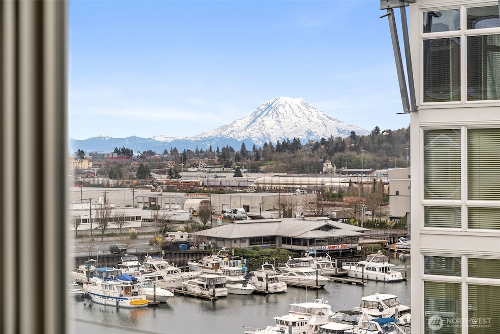 Indulge in stunning Mt. Rainier views from this urban Penthouse featuring soaring 12' ceilings and two spacious bedrooms, all on one level. The expansive great room is complemented by hardwood floors and a chic kitchen with premium appliances, breakfast bar and custom finishes. Enjoy al fresco dining on the deck with plumbing for a gas BBQ. Custom storage and a rentable locker offer ample space. Includes washer/dryer and two secure parking spaces. Thea's Landing provides exceptional amenities - fitness center, sauna and community areas. Located along Thea Foss Waterway near the Farmers Market and a vibrant arts scene. This is truly refined waterfront living at its finest.