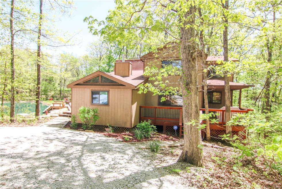 RELAXATION!! SERENITY!! PICTURE PERFECT!! This property, situated on its own private lake and picture framed by a towering oak forest, offers the perfect getaway coupled with all the amenities you could ask for. This 5-bedroom chalet offers plenty of space for friends and family to gather and relax for weekends or extended stays. The great room features a beautiful floor-to-ceiling stone stacked fireplace with an exceptional view of your own private lake. Step out through the sliding glass door and enjoy peace and quiet on your expansive private deck. The oversized deck features a recessed hot tub, pergola, gas grill and of course access to your own private lake! Enjoy a nice sunny day on your own beach with fresh sand or a nice cool evening surrounding the fire pit! Additional features include a large play set, new Tuff shed and a lighted fountain on the lake. Come and see your dream get away today!