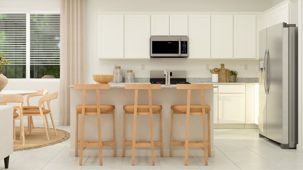 This single-story home has an open layout that seamlessly connects the the kitchen, Great Room and dining space creating the heart of the home. Plus, the sliding glass door opens to the covered patio for seamless indoor-outdoor living and entertaining. The two bedrooms in this home are split with one at the front of the home, while the owner’s suite is in the back with a private bathroom.