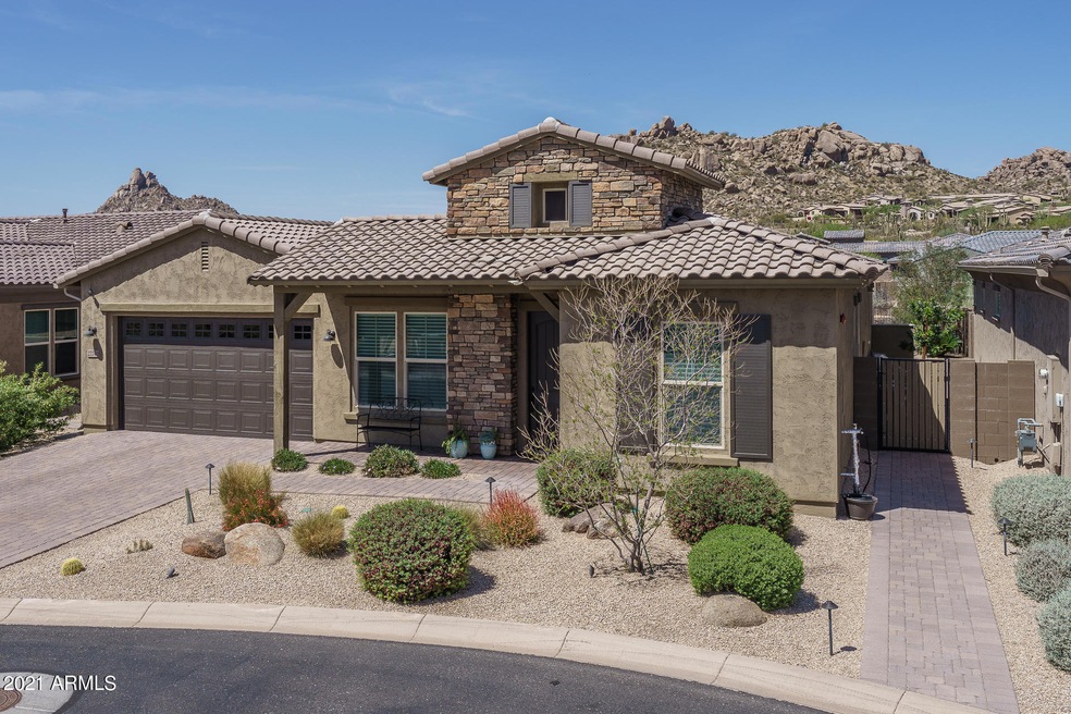 Located within the prestigious gated community of Ironhorse in North Scottsdale, this stunning home sits on a premium homesite bordering natural desert and providing mountain views from the backyard. The floor plan includes 3 bedrooms + open den & 2.5 baths in 2447 SqFt with an open great room and split bedrooms. The gourmet kitchen features white soft-close cabinetry with crown molding, under cabinet lighting & pull-out shelves; Quartz countertops, glass tile backsplash, GE profile stainless appliances, gas cooktop, wall-ovens, walk-in pantry, and island with breakfast bar and pendant lighting. An oversized sliding door with solar screen leads out from the great room to the covered patio with ceiling fan, electric shades, and gas stub for your BBQ. The professionally landscaped backyard extensive travertine paver patios and walkways, artificial turf, low voltage landscape lighting, custom water features, and view fencing to capture the pretty desert and mountain views. The master bedroom has a private exit to the patio and a luxurious bath with dual sink vanity, freestanding soaking tub, and tiled shower with bench seating. All bedrooms have walk-in closets, and both baths match the kitchen cabinets & countertops. Other features include an oversized 2 car garage, paver driveway & sidewalk, stone elevation, interior courtyard/atrium, upper/lower laundry cabinets & sink, custom window coverings, designer two-tone paint throughout, tray ceilings, tankless water heater, security camera system, and much more! This could be your dream home! Schedule your private showing today!