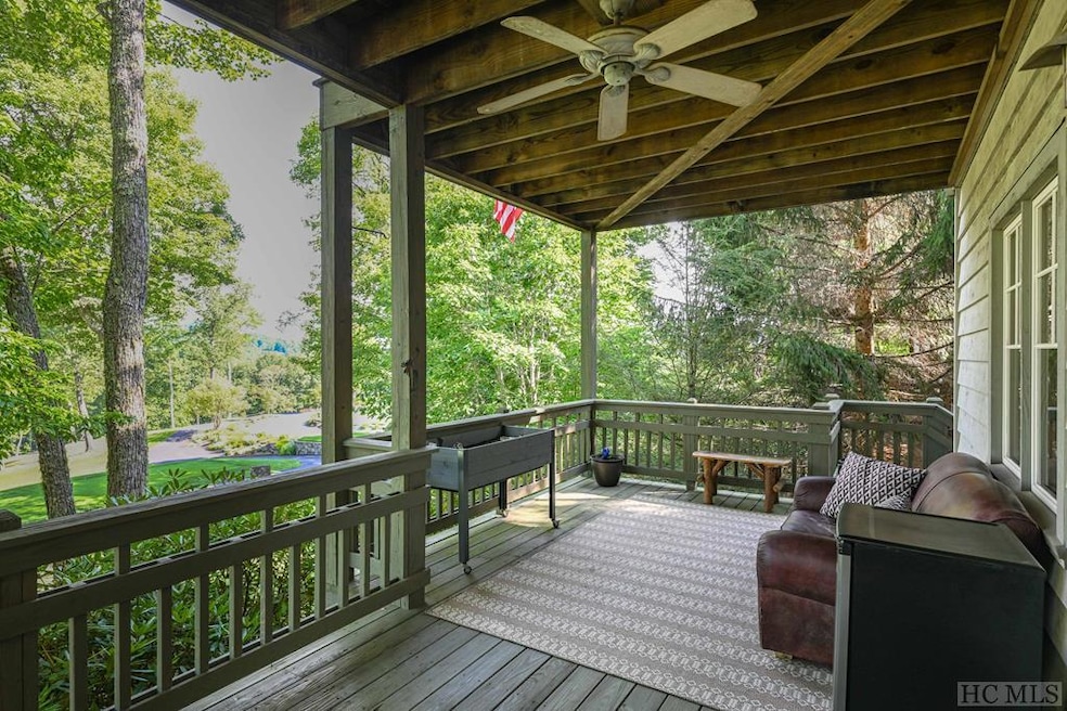 This charming home is poised above the tee boxes on the 1st tee of Trillium Links & Lake Club's iconic golf course and mere steps away from the Clubhouse doors. Situated on its own lot, this stand-alone three-bedroom, three-and-a-half bath home brims with rustic charm. Inside, cathedral ceilings with post-and-beam features beckon you to relax by the fire and enjoy the open-concept between the dining and living areas as you relish in the comforts of the mountain lifestyle. The primary bedroom, complete with the ensuite bathroom, is on the main floor, while the second and third bedrooms, complete with private bathrooms, are on the lower level. Larger families and guests will have privacy on the lower level with a wet bar and a second family room that provides additional living space for everyone to spread out. Experiencing the outdoors with your morning coffee in hand will never be easier as this home has ample covered deck space on both the main and lower levels, offering fantastic golf and mountain views. Recent upgrades to the home include a new roof in 2021, commercial grade gutters in 2022, new hot water heater in 2021, refinished wood floors on the upper/main level, and updated master bath flooring and fixtures. This home is uniquely positioned steps away from the Trillium Clubhouse and close to its highly desired amenities, including wonderful activities such as golf, croquet, indoor/outdoor tennis, a pool, and access to boating and dining on Lake Glenville. Some amenities do require a membership at an additional cost. The home comes furnished with a few exceptions and is hooked up to fiber optic internet, community water, and community sewer. Vacation rentals are allowed inside Trillium Links & Lake Club.