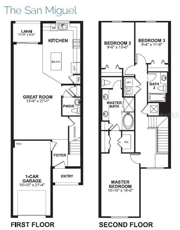 The Santa Miguel townhome unit offers 1,669 square feet of living space in 3 bedrooms, 2.5 baths, and a 1-car garage with 2 -car wide paved driveway. The first floor features beautiful wood look tile in all wet areas as well as in the great room/kitchen combo. The large L-shaped kitchen is tucked in the back of the home and is flooded with natural light with the window above the sink. 42” cabinets, quartz countertops, GE® stainless steel appliances, and the subway backsplash will delight the chef of the family. The island overlooks the great room keeping the flow perfect for entertaining. A sliding glass door off the dining area leads to the lanai where the fun will continue. You’ll find a linen closet off the powder bath and a huge storage area under the stairs. Head upstairs and you’ll find two secondary bedrooms and a hall bath in the back of the home and the owner’s suite privately situated in the front. In the owner’s suite, pass two closets on your way to the impressive bath that features an extra-long vanity with double sinks, a separate shower and soaking tub, an enclosed water closet, and a linen closet. The washer/ dryer hookup is also conveniently located upstairs. This unit is 100% Energy Star® 3.1 certified and includes R-38 ceiling insulation, Radiant Roof Barrier, Low-E double pane windows, and Energy Star® appliances.