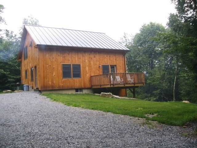 Open Floor Plan Post and beam with 4 bedrooms 2.5 baths on 9.46 acres +/- First floor has open Kitchen/Living/Dining concept with cherry floors, tile for entry and 1/2 bath. Living room opens up to a mahogany deck. Second floor has two large bedrooms with a full bath. Lower level with walkout has two bedrooms, family room, 3/4 bath, unfinished utility room with washer & dryer. Sustainably running off Rooftop solar & generator/inverter system. You'd never know though, because there is ample power to do everything you normally would, and more, with a battery bank to store your solar power and a propane generator for when the sun isn't enough. Quiet and secluded.