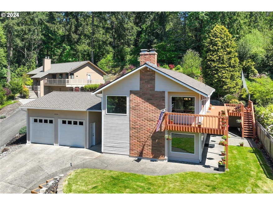 Exquisite home with multi generational living prospects! Remodeled NW Contemporary home boasting 2832 SF, 3 bdrms, 3 bthrms, light & bright living rm w/vaulted cedar ceiling-walls of windows, engineered hardwood floors-soaring brick fireplace, gourmet kitchen w/granite counters-custom cabinetry-tile floors, spacious dining rm w/slider to expansive viewing deck, primary bdrm w/ ensiute on main-tile shower-tile floor-granite counters, lower level family rm w/wet bar-kitchen area-FP w/pellet stove-door to covered patio. den/office, sauna/mud rm, laundry rm, heat pump, central vac, 50 yr presidential roof, 2 car garage & extra storage rm, manicured grounds & fully fenced back yard w/sprinkler system. The home is located on a dead end cul-de-sac.