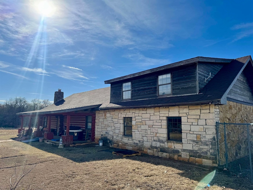 Tucked away on 5 secluded acres with sweeping views and just one neighbor, this true log cabin offers the rare combination of privacy, space, and craftsmanship just 10 minutes from town. Inside, the home features 5 bedrooms and 3 full baths, thoughtfully designed for both togetherness and separation. The upstairs master suite feels like a private retreat, complete with its own living space, kitchenette, and full bathroom—ideal for multigenerational living, guests, or a quiet escape. A separate kids’ wing includes three bedrooms and offers the flexibility to easily add an additional bathroom if desired. An office that doubles as a bedroom with built-in bookshelves adds even more versatility. The heart of the home is warm and inviting, vaulted ceilings, a rock, wood-burning fireplace with blowers, and an open bar area perfect for entertaining. The updated kitchen features modern appliances while maintaining the rustic charm that makes a log cabin feel like home. Additional updates include vinyl windows, a water softener system, New HVAC in 2024 and a brand-new roof installed December 2025. Outside, the property truly shines. A 30x40 fully insulated steel shop building with electric and water, two 10x12 overhead doors, ideal for projects, storage, or business use. The two-car carport, 6-foot chain-link fenced yard, and separately fenced cellar add both functionality and peace of mind. The home is served by well water, enhancing the property’s self-sufficient appeal. Private, peaceful, and packed with character—this is more than a home. It’s a lifestyle with views for days, room to breathe, and space to grow -- think Montana off the grid vibes in southern Oklahoma.