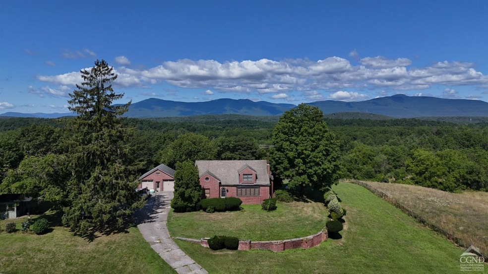Nestled between the Hudson River and HITS on the Hudson, this 2,700+ sqft brick Cape home exudes charm and elegance. Positioned proudly on a hill with a classic slate roof, it offers sweeping mountain views that will take your breath away. The property spans 8.2 acres of lush pastures and includes two barns (one with water and electric), a detached two-car garage, and a garden shed. Inside, the first floor features beautiful hardwood floors throughout, a cozy wood-burning fireplace in the living room, and a modern kitchen with stainless steel appliances. The dining room is ideal for gatherings, and there are two spacious bedrooms as well as a full bathroom with a tiled floor and shower. Charming arched doorways add to the home's architectural appeal. The second floor houses two generous bedrooms, one of which includes a nook perfect for a nursery or large walk-in closet. Additional spaces on this floor include a den and a half bathroom. The basement offers flex space accessible from both the interior and a separate exterior entrance, providing versatile use options. This estate has excellent potential, easily convertible into a mother-daughter apartment or two-family residence, offering substantial income potential. There's also the possibility to subdivide the property. Utilities include municipal water and sewer. Located close to dining, shopping, and golfing, the property is conveniently near the charming town of Saugerties and just 15-30 minutes from Woodstock, Hudson, and Catskill. This estate is perfect for a full-time residence, vacation home, or investment property. Currently tenant-occupied, minimal interior photos are available to maintain privacy. Contact us today to schedule a viewing and make this dream property yours!