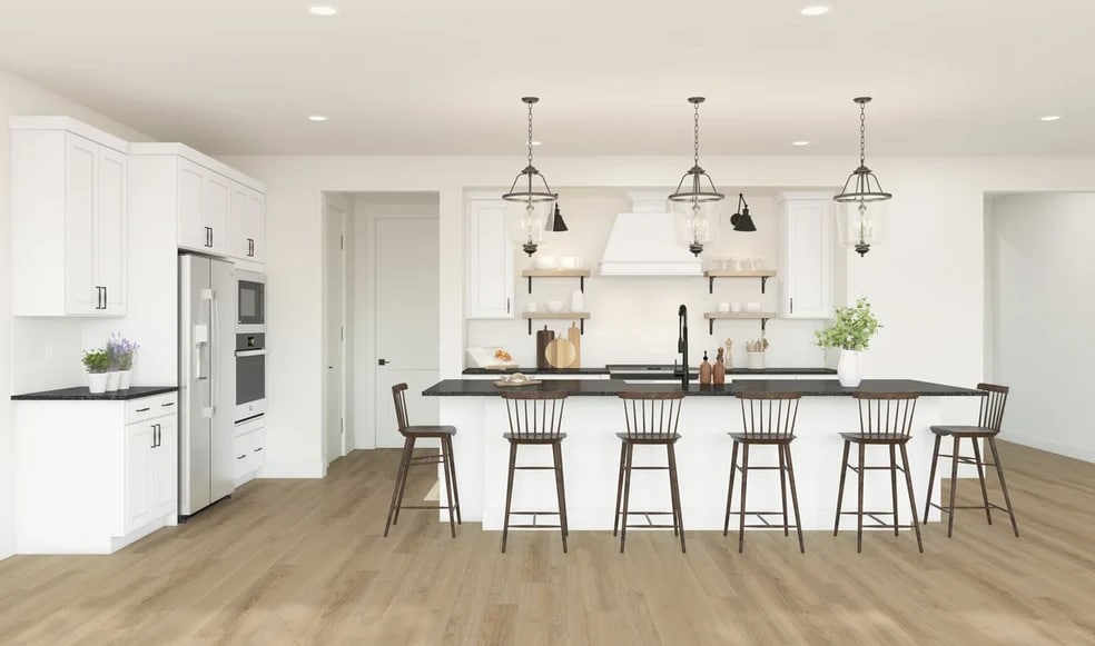 Sleek kitchen featuring white cabinetry & pendant lights. Vast center island overlooking main living spaces. Tranquil primary suite & bath featuring freestanding tub. Versatile loft perfect for leisure activities. Cozy deck for spending time outdoors. Attached 2-car garage provides convenient parking.
