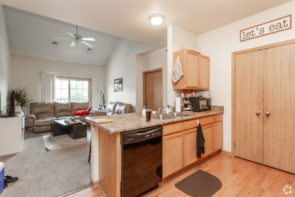 Spacious floor plans featuring magnificent views of the Iowa State Center. The kitchen features a large pantry and countertop seating that opens to the living room. In-unit washer and dryer offer the convenience of doing laundry while relaxing or studying.