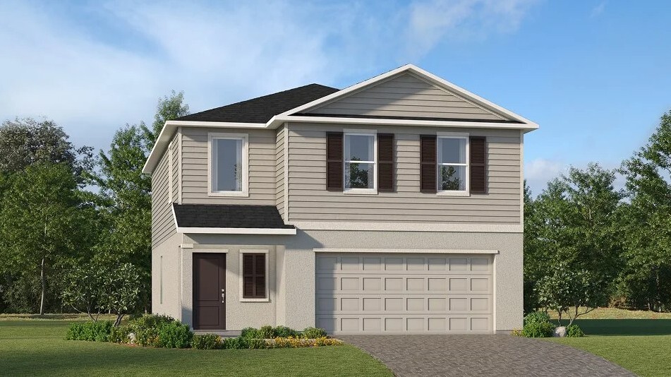 The Columbus floor plan at Turnleaf by GreenPointe Holdings is a spacious two-story home designed for both comfort and functionality. With four bedrooms and three bathrooms, it offers plenty of room for family and guests. The primary bedroom suite features a walk-in closet and a luxurious bathroom with a walk-in shower and bathtub. The open floor plan seamlessly connects the family room, dining area, and eat-in kitchen, which is equipped with a kitchen island, breakfast bar, walk-in pantry, and modern fixtures like a dishwasher and microwave. High ceilings and recessed lighting enhance the airy feel of the space, while the loft provides additional flexibility for work or play. The laundry room, conveniently located on the upper level, adds practicality, and the direct access garage ensures ease of entry. Outdoor living is just as inviting, with a covered patio, front porch, and a yard perfect for relaxing or entertaining. Central air and heating, along with high-speed internet and cable availability, complete the modern living experience.