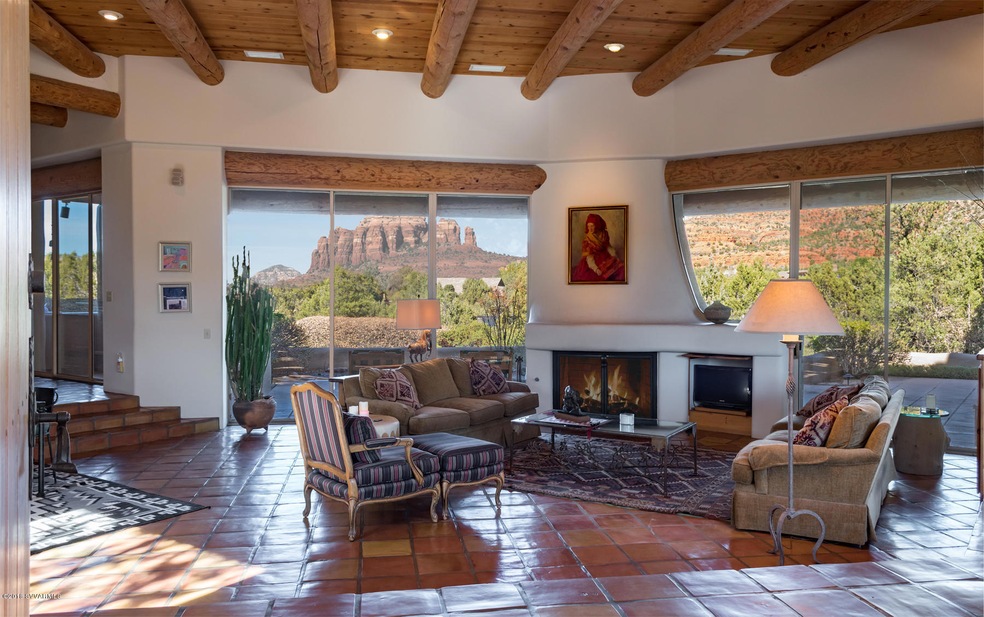 Home located on 2.69 acres, the largest lot in gated Highland Estates. Pass through doors in a stucco wall will bring you into a private front courtyard. Then enter into the great room with fireplace. Views out to Cathedral Rock will awe you from the living room, kitchen, bedrooms, studio and definitely from the rear patios. Vigas adorn the indoor ceilings. Lintels above the windows are exposed as design elements. Outside, the tile roofed portals are for watching sunsets. Designed by Don Wood. Built by Ethan Foster.