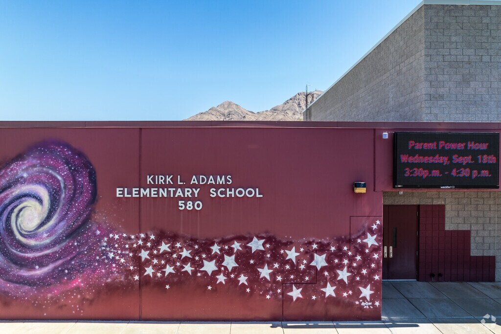 Kirk Adams Elementary School is a public school for students in grades Pre-K-5 in Las Vegas, NV, in the Sunrise Manor neighborhood, and is served by the Clark County School District in Nevada. Annual tuition is $0. The school has a total enrollment of 404 and maintains a student-teacher ratio of 17:1. Academic records show that 21% of students achieve proficiency in math, and 30% are proficient in reading. Kirk Adams Elementary School has received feedback and ratings, with a Niche grade of C and a GreatSchools Rating of 3 out of 10. The average home value in this area is $534,816. Discover additional schools in the area, like Eldorado High School, Las Vegas High School, Sunrise Mountain High School, and more. Learn more about what Las Vegas has to offer, and browse homes for sale and for rent near Kirk Adams Elementary School.
