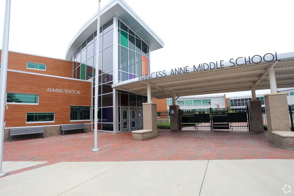 Princess Anne Middle School is a public school for students in grades 6-8 in Virginia Beach, VA and is served by the Virginia Beach City Public Schools in Virginia. The school has a total enrollment of 1,332 and maintains a student-teacher ratio of 18:1. Academic records show that 79% of students achieve proficiency in math, and 85% are proficient in reading. Princess Anne Middle School has received feedback and ratings, with a Niche grade of A and a GreatSchools Rating of 9 out of 10. The average home value in this area is $518,385. Discover additional schools in the area, like Floyd E. Kellam High School, Landstown High School, Old Donation School, and more. Learn more about what Virginia Beach has to offer, and browse homes for sale and for rent near Princess Anne Middle School.